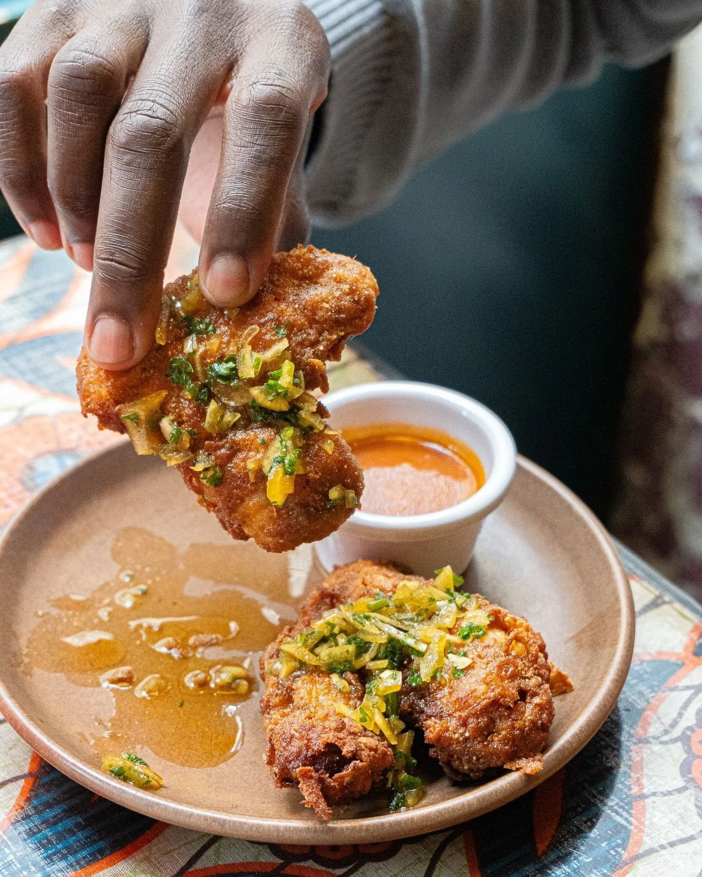Mercredi - Poulet allocos : Cuisse de poulet marinée au gingembre et grillée, accompagnée de morceaux de banane plantain frits et d’une spicy mayo